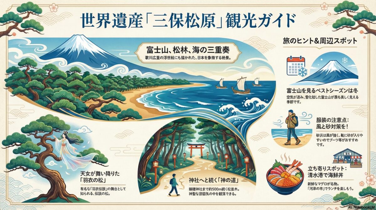 この記事では、三保松原の基本情報から、世界遺産としての価値、羽衣伝説と信仰の歴史、見どころとモデルコース、アクセスや周辺観光、食事情報、観光の注意点までをまとめてご紹介します。読み終えるころには、「三保松原に行ってみたい」「次に静岡に行くときはここもコースに入れよう」と感じていただけるはずです。
